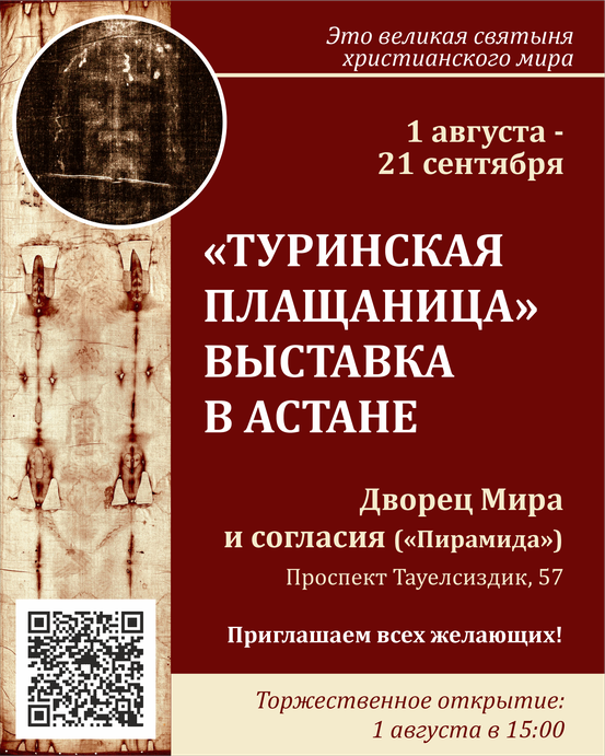 *01 августа в 15:00 состоялось торжественное открытие выставки Туринской Плащаницы в Дворце Мира и Согласия. Выставка в Астане продлится до 21 сентября 2025 года.